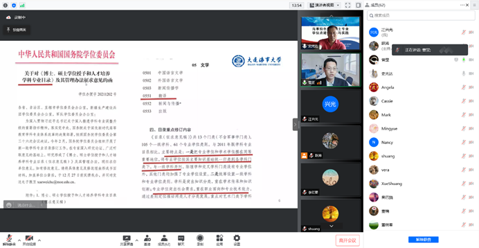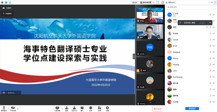 2022年4月20日15:00,大连海事大学Williamhill中文院长曾罡教授应邀为Williamhill中文教师做了题为“海事特色翻译硕士专业学位点建设探索与实践”学术讲座。受疫情影响,学术讲座使用腾讯会议平台线上进行。